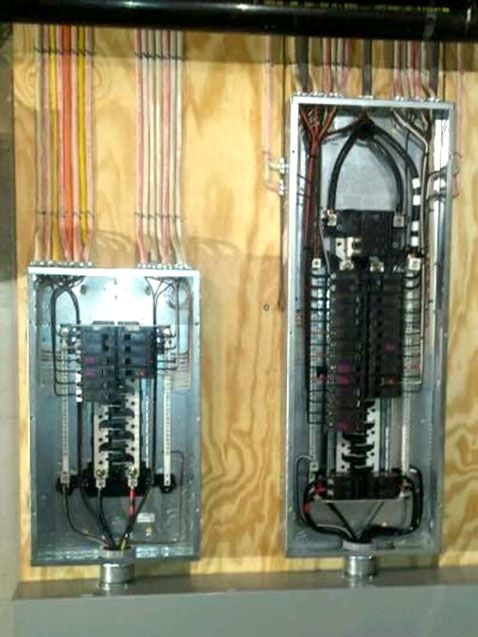 Två elcentraler på en trävägg med synliga kablar anslutna till säkringarna.